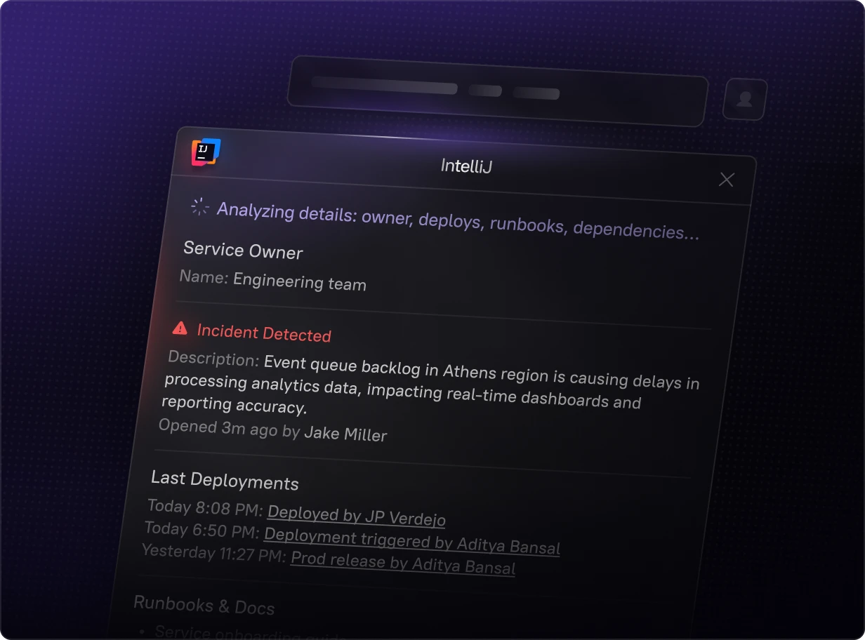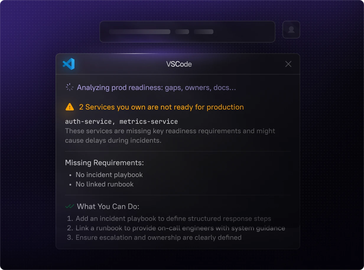 Ask questions like "Who owns this?" or "What are the runbooks for this service?" directly from your IDE. Cortex MCP eliminates the need to dig through tools and tabs, speeding up day-to-day development.
